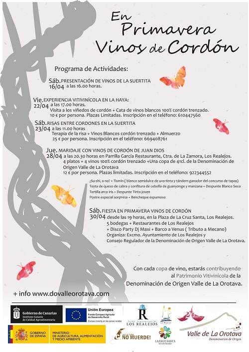 Además, el próximo Sábado 30 de Abril, en la Plaza de la Cruz Santa, desde las 19 horas, 6 bodegas ( Los Güines, La Haya, Juan Dios, La Suertita, Valleoro y Socorro Fuentes) pondrán a degustar sus vinos en un ambiente de cordones trenzado, unido a la música de una banda de la isla, Barco a Venus, con el Tributo a Mecano y Dj Maxi con música de los 80s. Evento organizado por Turismo de Los Realejos y Consejo Regulador de la Denominación de Origen Valle de La Orotava.